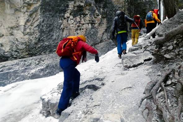 We covered how to attach ice cleats for traction and how to coach people when walking on slippery surfaces. When we reached the frozen ice section I suggested that we put on our traction cleats (We recommend these ones). Our instructor threw us a curveball. “What if someone forgot their cleats, or they broke and couldn’t be fixed, what would you do?” So we moved through the first section of the icy creekbed in only our boots. I had to be so careful choosing each step, seeking out rough rocks to step on (I called these, “traction gifts”), and shuffling along the ice like penguins. I enjoyed learning how to coach folks on tricky/slippy terrain, as well as the importance of double checking we have all the right gear and know how to repair it.