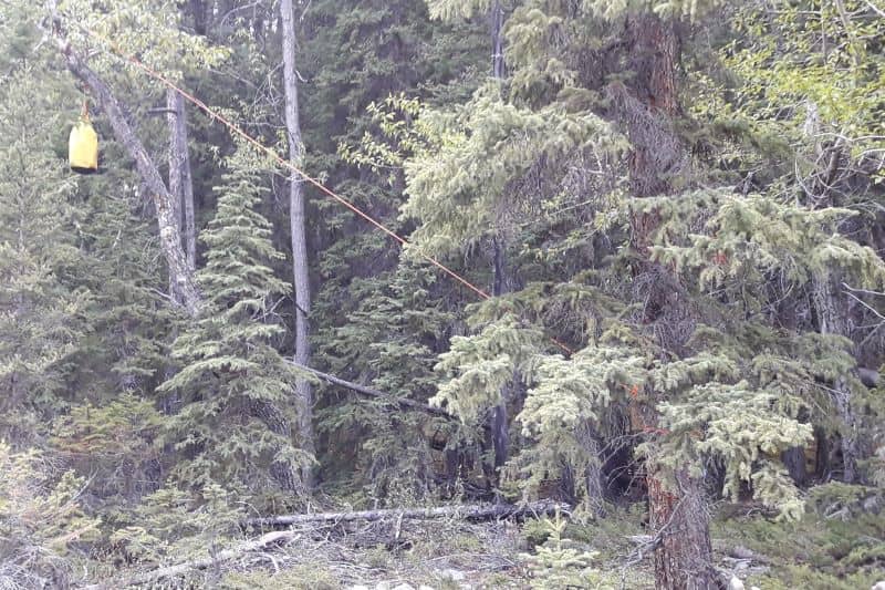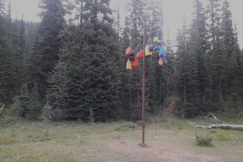A bear hang is used to hang our food and other smelly items out of reach of bears and other animals. Often provided at established campgrounds in Banff National Park, bear hangs can be a tall metal pole with cables and pulleys, allowing food and smellies to easily be pulled to the top. When camping off trail, or outside of an established park, we need to make our own bear hang using rope and trees.