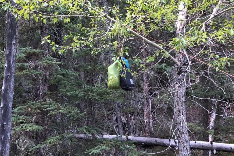 To make your own, you will need 20m of rope or cord, and weather resistant bags to store food in. EVERYTHING that a bear could consider “interesting” should go in a bear hang. Bears are interested in many things, so the list is long and includes: food, food waste, food wrappers, pots and cooking/eating utensils, soaps, insect repellents, sunscreen, lip balm, toothpaste, hand sanitizer, toiletries, deodorant, and water bottles and thermoses that have had any flavored drinks in them.
