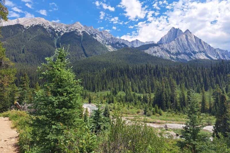 After the inkpots, we packed up our stuff and continued on up the valley. There were several bridges to navigate, the first was over the rushing Johnston Creek (which would flow down to become Johnston falls in the canyon), and others were over dry creek beds. We hiked this part of the trail at the end of July, so some of the bridges are meant to keep hikers out of the streams and mud in spring conditions. The valley offered lots of open views of Mount Ishbel with it’s striking limestone features and massive Mystic Peak. This was prime bear territory, so we were glad we were equipped with bear spray and the knowledge of how to travel in bear country. The wildflowers were gorgeous and in their full glory, and we stopped many times to admire them.