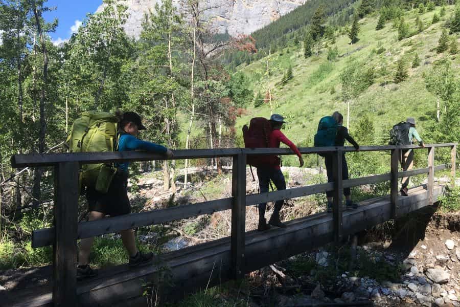 After checking through everyone’s bags to make sure they had everything they needed (and not too many luxury extras), we set off on our hike. We passed the boat dock where kayaks and canoes were available for rent (thinking to ourselves perhaps we should do a padding adventure one day!) Soon we had left the busy parking lot behind us and were able to take in the beautiful mountains around us, crossing several bridges. Our trail was very well marked and easy to follow as it parallelled the shore, though some of the bridges did require some balance and a teeny bit of bravery.